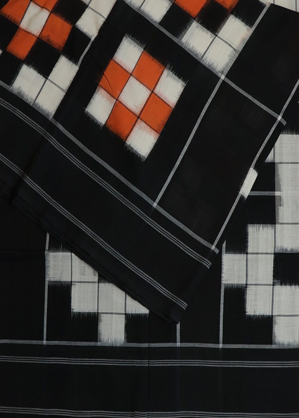 A traditional handloom special design Pochampally cotton saree from TSCO, by the weavers of Pochampally, Telangana. The saree has woven all over with black color with multi-checkered and border of the saree has woven on black. The Pallu is extremely rich woven on the base of black with checks design. Saree comes with running blouse piece. This saree is certified by Handloom mark of India.