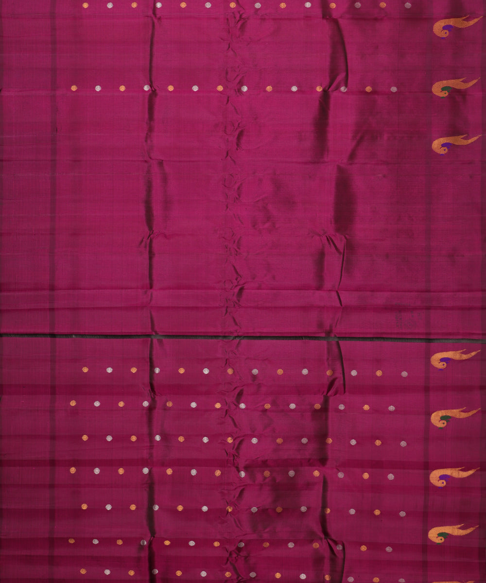This Gadwal saree is a traditional type of handloom sari originating from the city of Gadwal in Telangana, India. The intricate embroidery, thread work, and fine checks in the fabric make this saree a luxurious piece of clothing. The saree's cultural history of more than 500 years makes it a beautiful symbol of Indian heritage and this saree is certified with Silk mark of India.