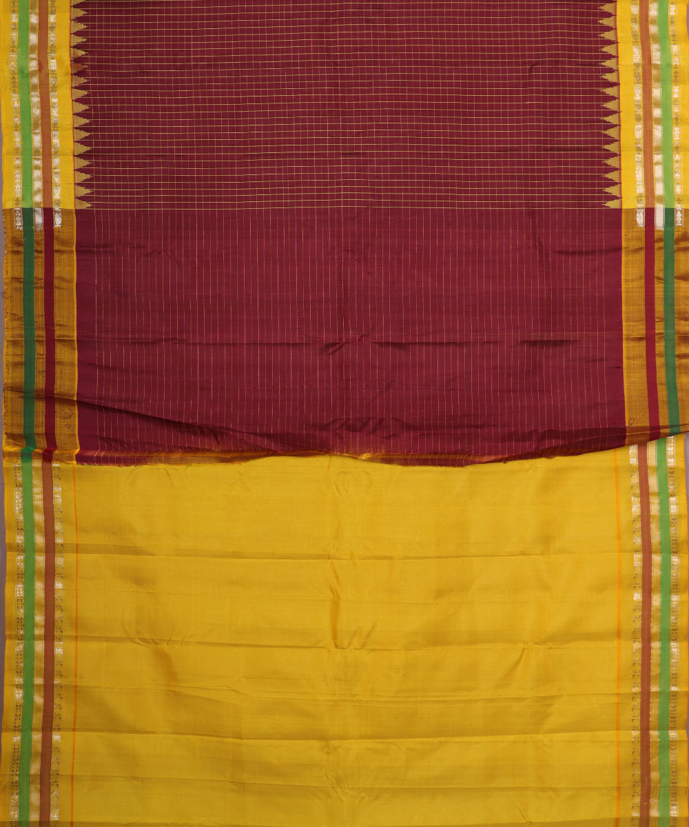 This Gadwal saree is a traditional type of handloom sari originating from the city of Gadwal in Telangana, India. The intricate embroidery, thread work, and fine checks in the fabric make this saree a luxurious piece of clothing. The saree's cultural history of more than 500 years makes it a beautiful symbol of Indian heritage and this saree is certified with Silk mark of India.