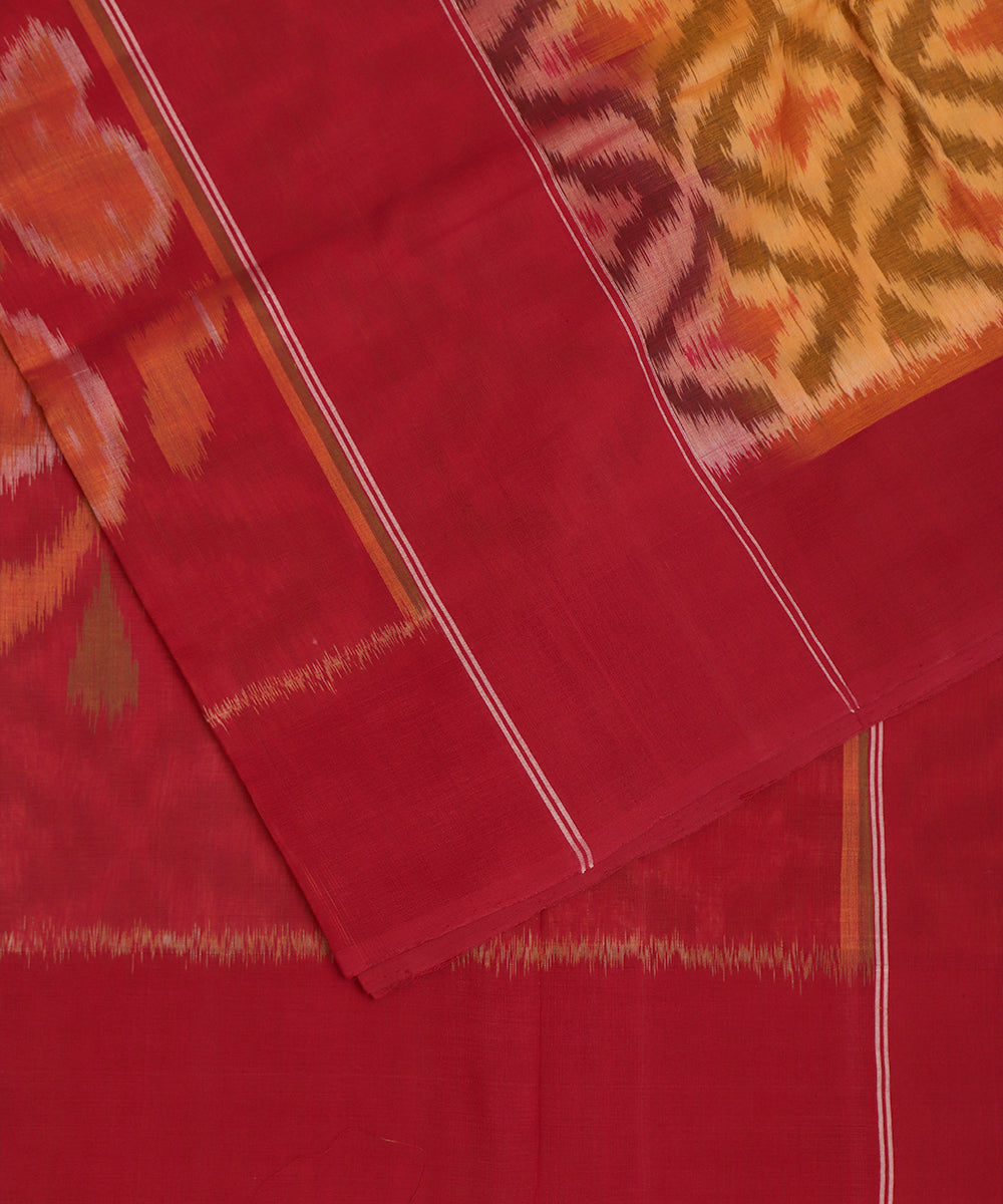 Pochampally Cotton Saree is a unique and beautiful garment known for its intricate patterns and vibrant colors. Originating from the Pochampally town in Telangana, India, these sarees are handwoven using the traditional Ikat technique, where the yarns are tie-dyed before weaving to create stunning, geometric designs. Saree comes with running blouse piece. This saree is certified by Handloom mark of India.