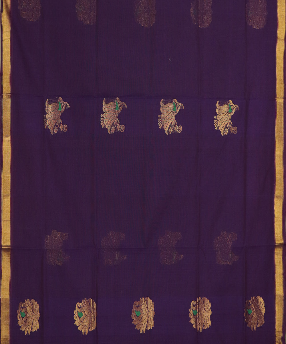 A traditional pure hand woven rajahmundry cotton saree in eggplant violet color with motifs design on body and added zari border. The pallu is woven on violet shade with added motifs design. This saree is certified by Handloom mark of India.