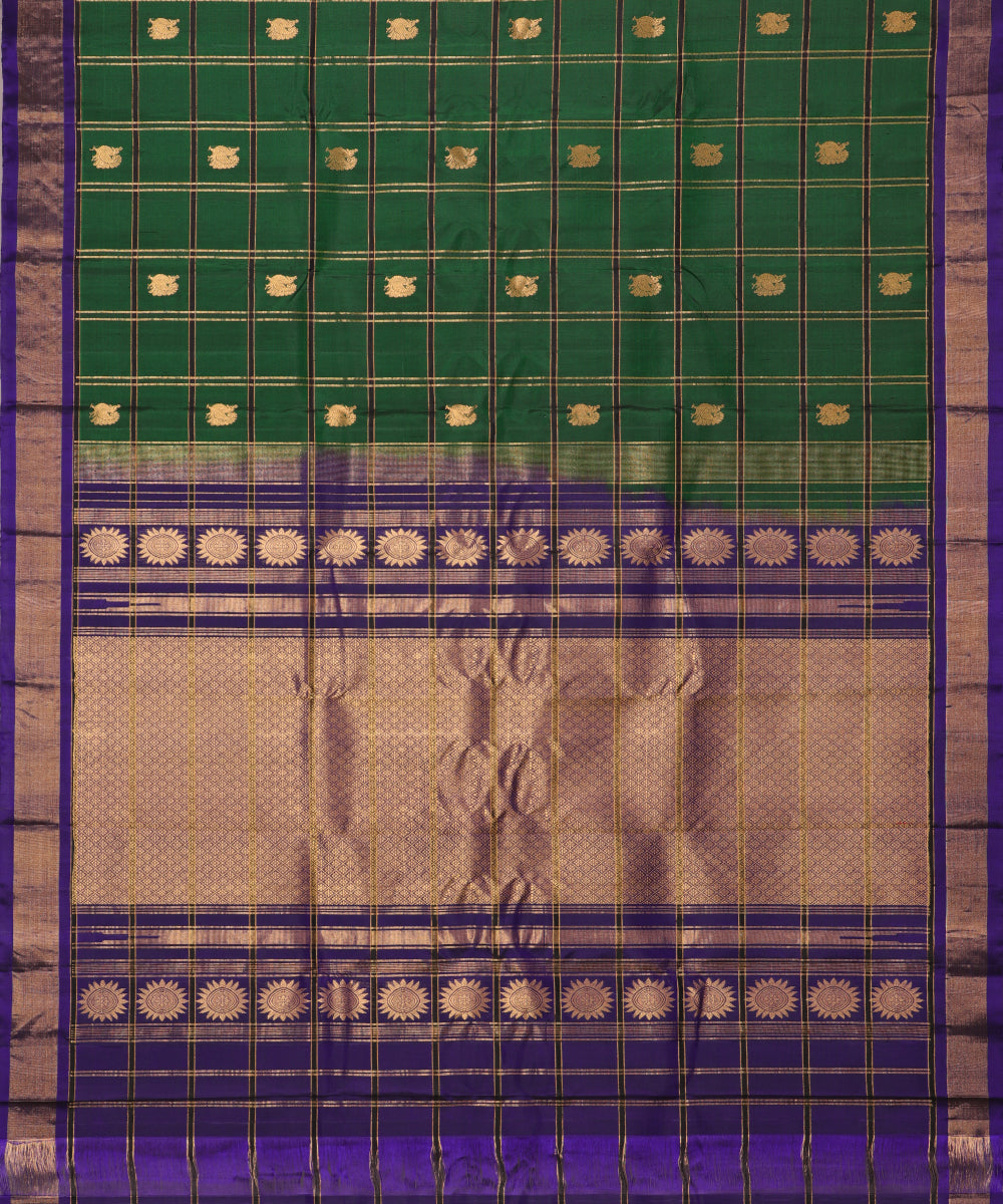 This Gadwal saree is a traditional type of handloom sari originating from the city of Gadwal in Telangana, India. The intricate embroidery, thread work, and fine checks in the fabric make this saree a luxurious piece of clothing. The saree's cultural history of more than 500 years makes it a beautiful symbol of Indian heritage and this saree is certified with Silk mark of India.