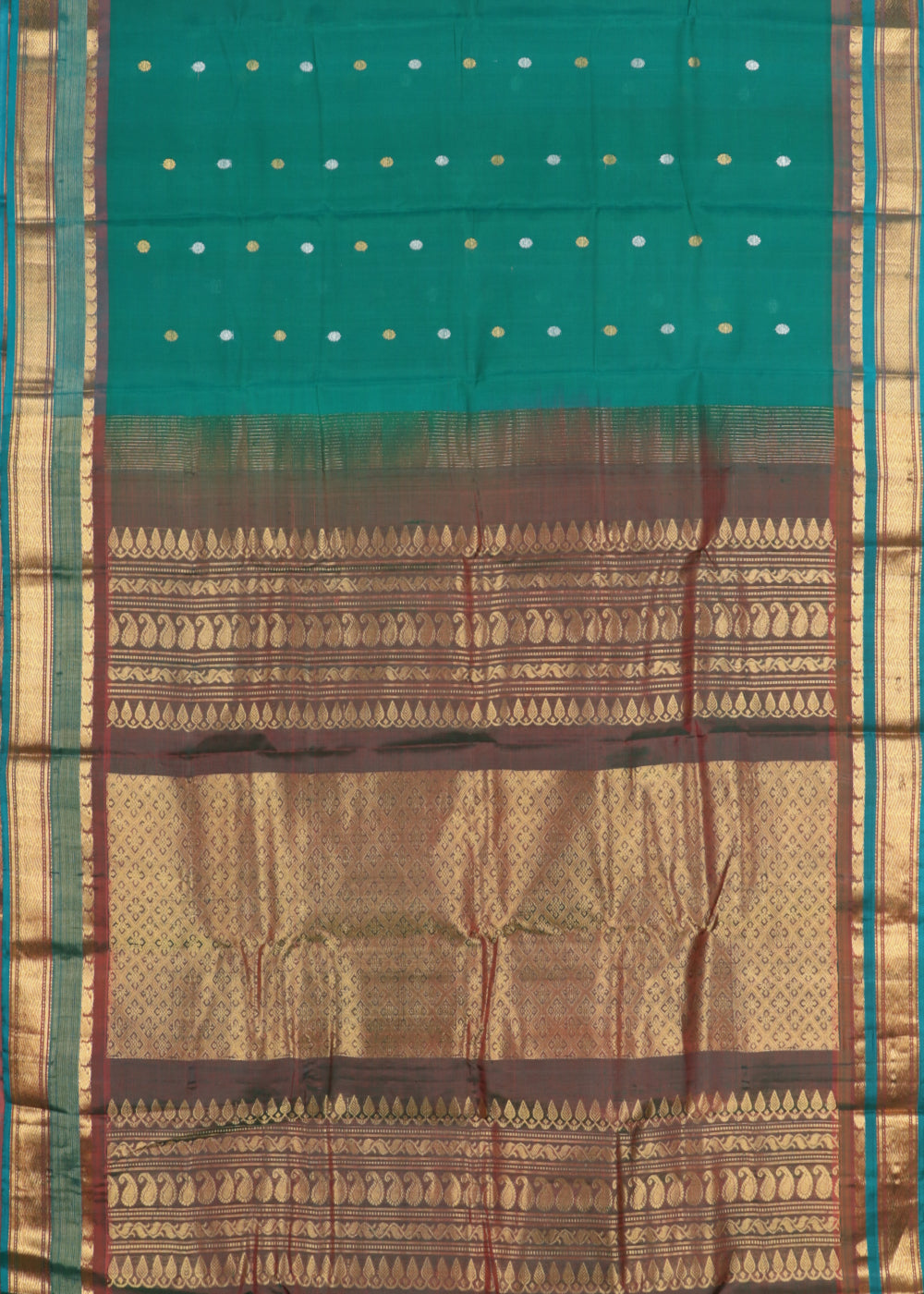 A traditional handloom Gadwal SICO saree from TSCO, by weavers of Gadwal town which is located at Mahbubnagar dist (AP). The body of the saree has woven pine green color with golden zari border. The pallu is woven with a barn red shade base interwoven with golden zari as weft stripes and bands. This saree is certified by the Handloom mark of India.