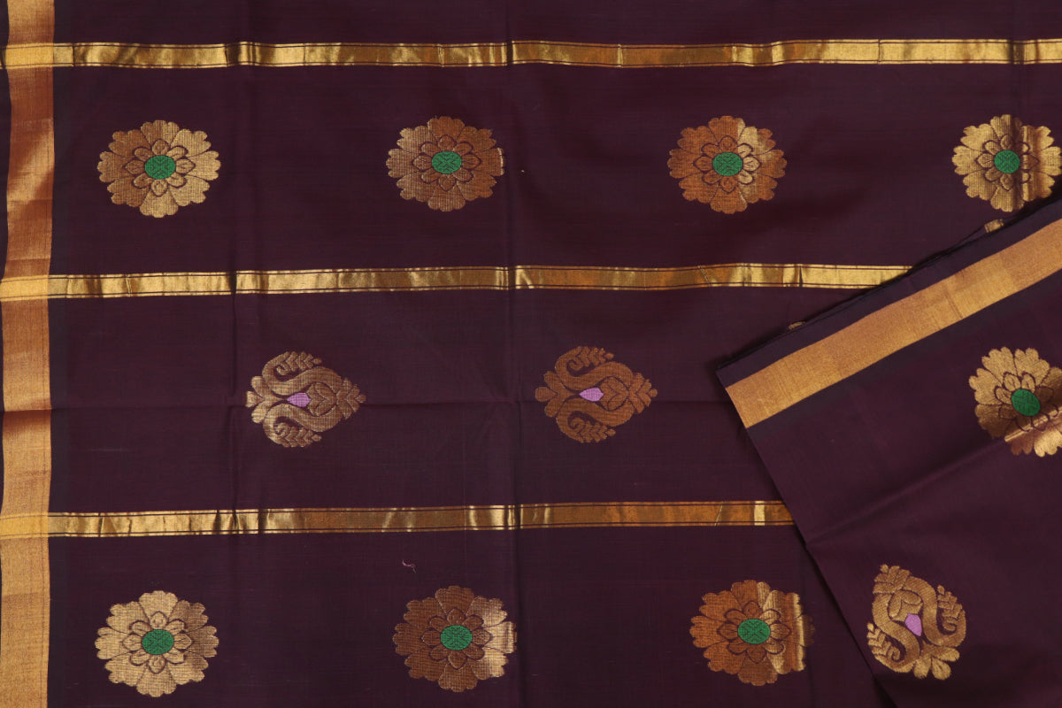 A traditional pure hand woven rajahmundry cotton saree in Mahogany red color with motifs design on body and added zari border. The pallu is woven on red shade with added motifs design. This saree is certified by Handloom mark of India.