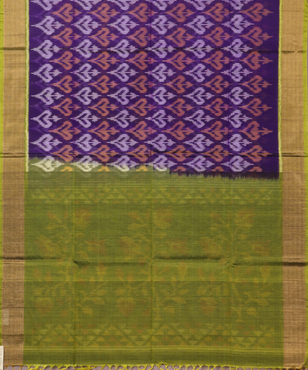A traditional pochampally handloom sico saree by the weavers of Pochampally HWCS, Nalgonda district, Telangana state. This gorgeous saree is woven with green color saree body is highlighted with small ikat motifs in multi color. Golden zari interwoven with blue sico yarn stripes are designed for the saree borders. The pallu is traditionally woven with thin zari in blue base color.